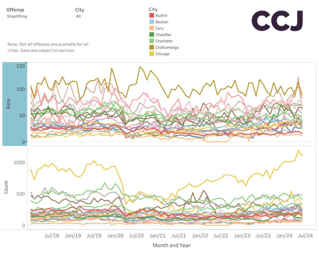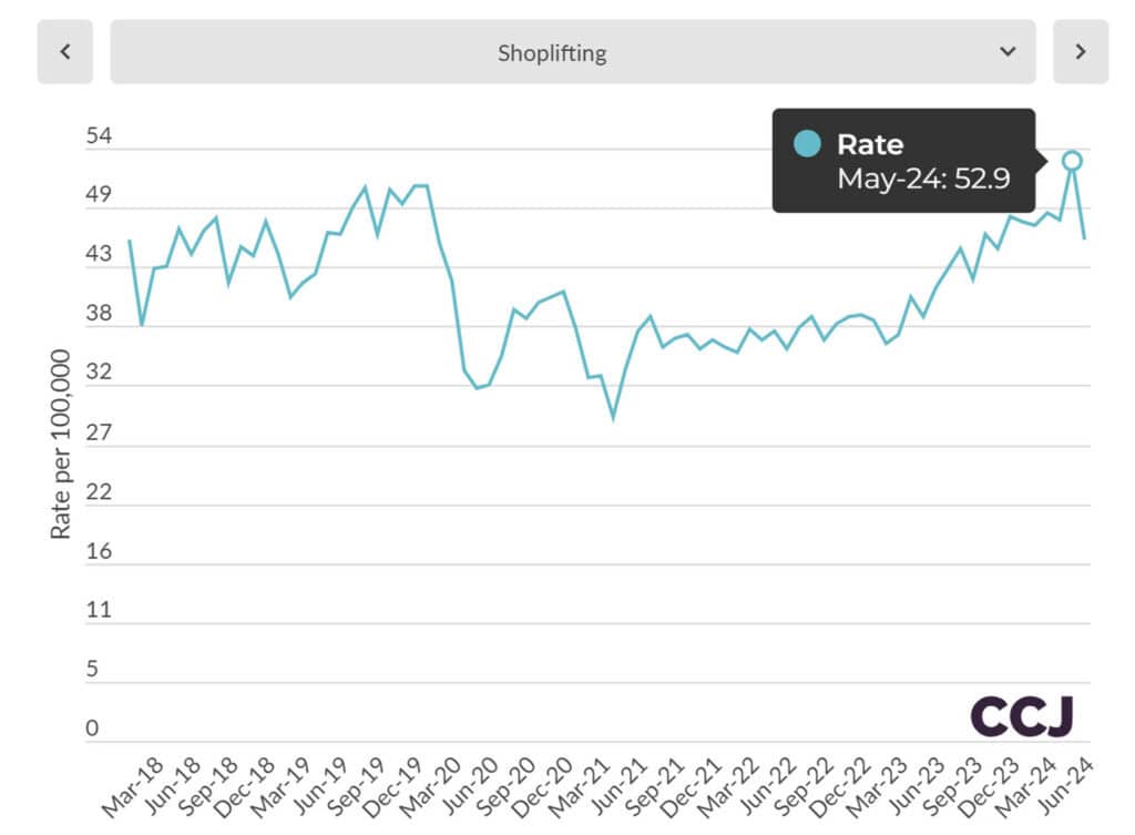 Earlier this month, the Council on Criminal Justice (CCJ) released statistics on crime rates across the country, which quantified the rising concern retailers have been facing regarding shoplifting. Despite falling rates of violent crime across the country to either at or below pre-pandemic levels, one statistic stands out: Retail theft is on the rise at an alarming rate, up 24% in the first half of the year compared to the same period in 2023. In May of this year, the CCJ reported the highest monthly crime rate since before 2018 for shoplifting, as depicted in the below chart.
